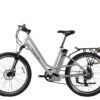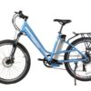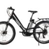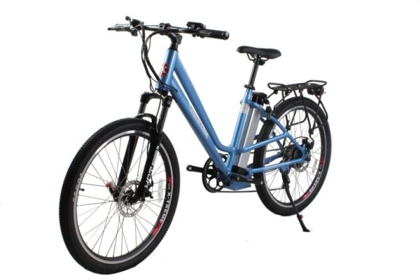 The Trail Climber Elite Max 36 Volt Electric Step-Through Mountain Bicycle is a Lithium Battery powered Electric Bicycle, running on a 350 Watt Zero Resistance rear hub motor. Made with all top of the line components this model includes a 7 Speed Shimano Tourney® Gears & Shifter System, 7 Lightweight Lithium LiPo4 Batteries, a 100% Aluminum Alloy Frame, fully Adjustable Seat, and a Suntour hydraulic front fork. This bike comes equipped with a LED Panel for the PAS (Pedal Assist System) attached to the handlebars. The PAS provides 4 speed options – Zero (Pedal Power Only), Low, Medium and High.