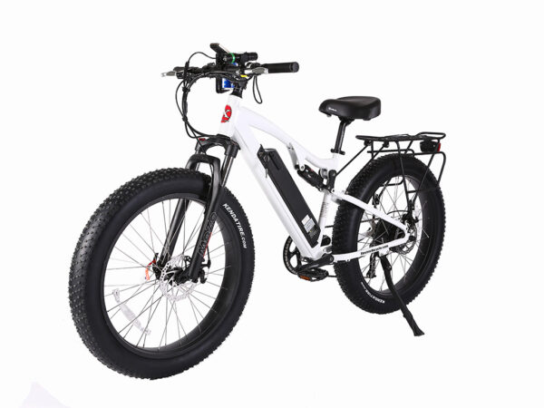 The Rocky Road 48 Volt Lithium Powered Electric Fat Tire Mountain Bicycle is a Lithium Battery powered Electric Bicycle cranking out 500 Watts from the Bafang High Torque Zero Resistance Clutch Motor. This bike features a lightweight, compact lithium LiPo4 48 volt 10.4 Ah integrated battery pack providing a considerable amount of power greater than our 24 volt or 36 volt models. This bike comes with everything Aluminum – every bolt, every nut, every nipple, every spoke. That means no rust! The 100% hand welded lightweight aluminum frame bicycle has Atlus Shimano 9-Speed Gears & Shifting System, oversized MOZO Front Hydraulic Suspension & KS Rear Shock Suspension, aluminum rims with quick release axle on the front and a water proof quick disconnect on the rear and oversized Kenda 26 x 4.0 tires.